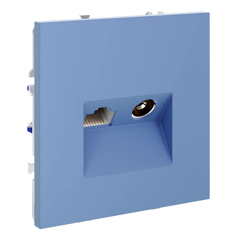 Деним — это не цвет. Это отношение. Розетка TV+RJ45 VOLTUM в исполнении «деним» — для тех, кто строит дом не по каталогу, а с характером. Где технологии работают безупречно, а дизайн говорит о вас без слов.