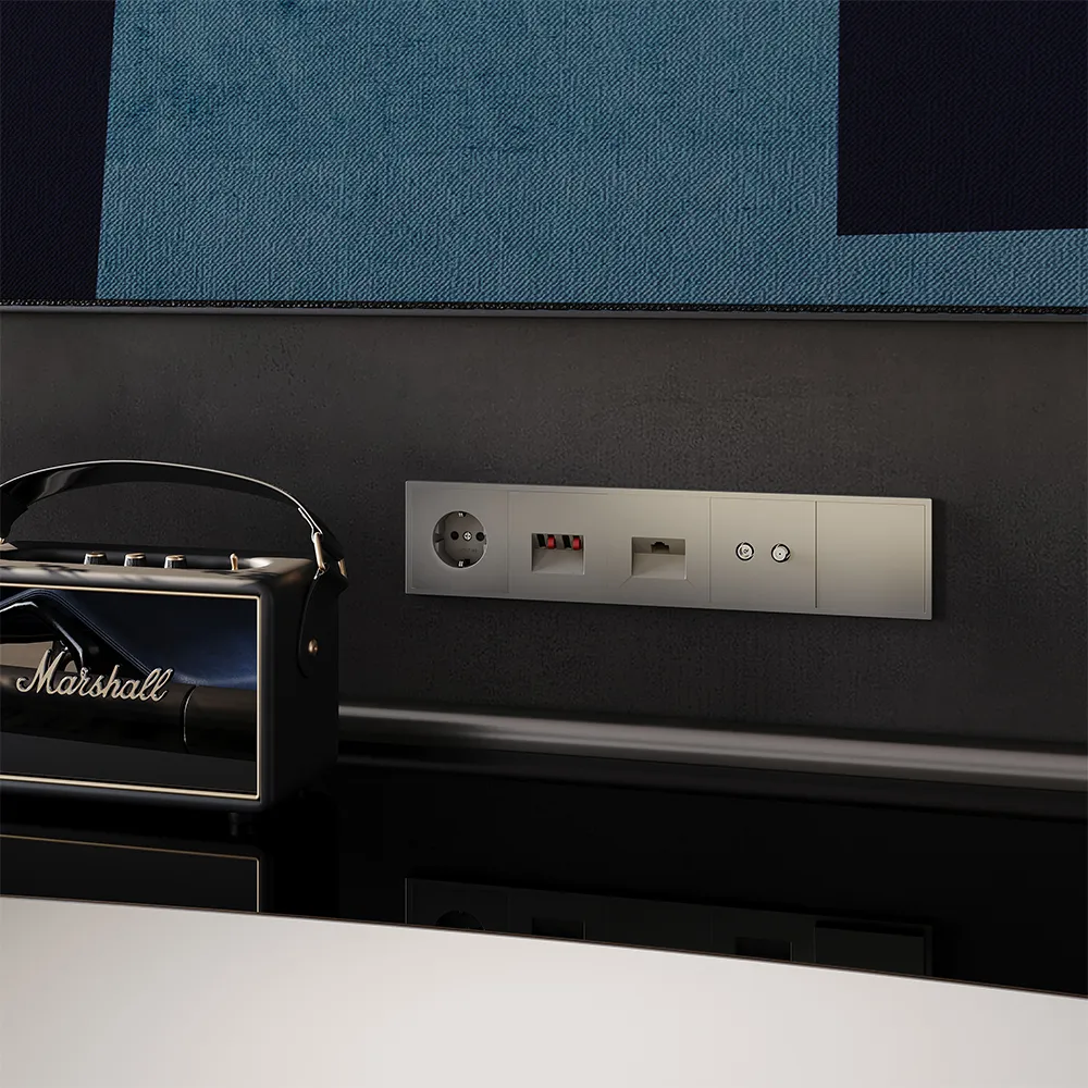 Благодаря встроенным разъёмам вы можете быстро и надёжно подключить до четырёх каналов акустики (например, фронтальные, тыловые колонки и сабвуфер), а при необходимости — так же легко отсоединить оборудование. Все акустические кабели скрыты внутри стены, что исключает путаницу и повышает безопасность.