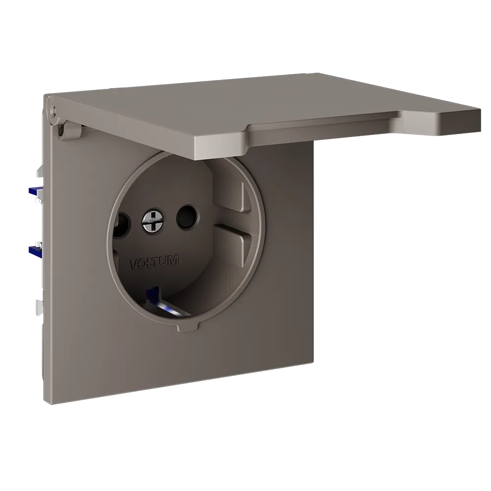 Розетка VOLTUM S70 с заземлением и защитными шторками и откидной крышкой  — это решение максимальной безопасности и эстетики для современного интерьера. Идеально подходит для детских комнат, ванных, прихожих, кухонь и уличных зон под навесом, где важна защита от пыли, брызг и случайного контакта с токоведущими частями.